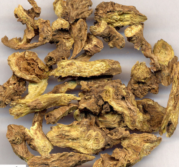 【别名】腐肠(《本经》),黄文、虹胜、经芩、印头、内虚(《吴普本草》),空肠(《别录》),元芩、土金茶根(《东北药植志》)。 【来源】为唇形科植物黄芩的根。春季至夏初采收(秋季亦可)。选生长3~4年的植株。将根挖出后除去茎苗、须根及泥土,晒至半干时撞去栓皮,再晒至全干。 【原形态】 黄芩,又名:空心草、黄金茶。 多年生草本,主根长大,略呈圆锥状,外皮褐色。茎方形,高25~60厘米,基部多分歧,光滑或被短毛。叶对生,卵状披针形、披针形或线状披针形,长1.5~4.5厘米,宽3~12毫米,先端钝或急尖,基部圆形,全缘,具睫毛,上面光滑或被短毛,下面有腺点,光滑或仅在中肋有短毛;无柄或有短柄。总状花序脓生,花偏向一方;萼钟形,被白色长柔毛,先端5裂;花冠唇形,上唇比下唇长,筒状,上部膨大,基部甚细,紫色,长2~2.5厘米,表面被白色短柔毛;雄蕊4,2强;雌蕊1,子房4深裂,花柱基底着生。小坚果4,近圆形,黑色。花期7~8月。果期8~9月。 【性状】 干燥根呈倒圆锥形,扭曲不直,长7~27厘米,径约1~2厦米。表面深黄色或黄棕色。上部皮较粗糙,有扭曲的纵皱纹或不规则的网纹,下部皮细,有顺纹或细皱纹,上下均有稀疏的疣状支根痕。质硬而脆,易折断;断面深黄色,中间有棕红色圆心。老根断面中央呈暗棕色或棕黑色朽片状,习称枯黄芩或枯芩;或因中空而不坚硬,呈劈破状者,习称黄芩瓣。根遇潮湿或冷水则变为黄绿色。无臭,味苦。以条粗长、质坚实、色黄、除净外皮者为佳。条短、质松、色深黄、成瓣状者质次。 【化学成分】黄芩根含黄芩甙元、黄芩甙、汉黄芩素、汉黄芩甙和黄芩新素,还含苯甲酸、β-谷甾醇等。茎叶中含黄芩素甙。 【炮制】黄芩:拣去杂质,除去残茎,用凉水浸润或置开水中稍浸捞出,润透后切片晒干(注意避免曝晒过度发红)。酒黄芩:取黄芩片喷淋黄酒,拌匀,用文火微炒,取出,晾干。(每黄芩100斤,用黄酒10~15斤)炒黄芩:取黄芩片用文火炒至表面微焦为度,取出,放凉。黄芩炭:取黄芩片用武火炒至表面焦褐色、边缘带黑色为度,但须存性,喷淋清水,取出,晒干。 |