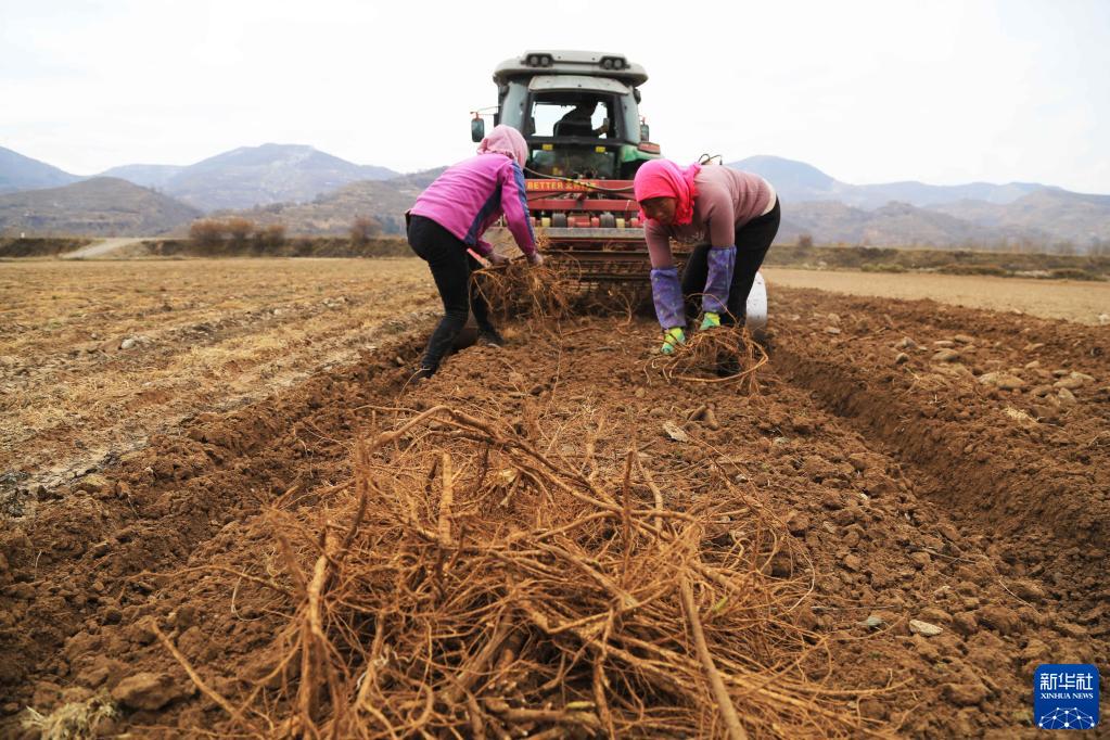 11月11日,甘肃省定西市岷县梅川镇农民在采收黄芪