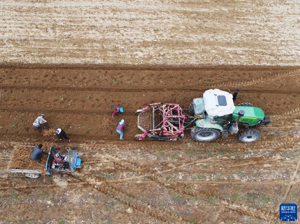 11月11日,甘肃省定西市岷县梅川镇农民在采收黄芪(无人机照片)