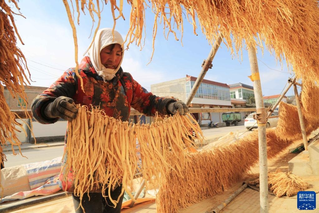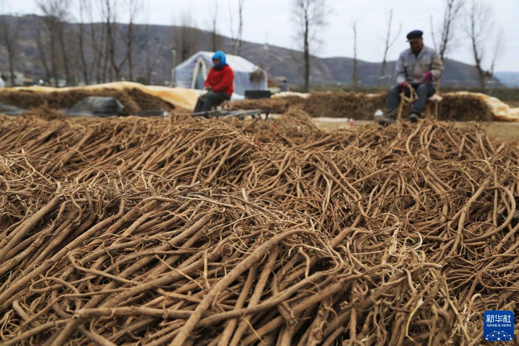 11月11日,甘肃省定西市岷县梅川镇农民在整理黄芪