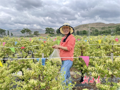 参加金银花采摘大赛的村民个个精神抖擞 “金银花采摘大赛正式开幕……”10时许,比赛开始,蒲月梅提着小篮子,急匆匆地赶到115号赛道。 “种了3年,我家2.5亩金银花越长越繁,端午过后开始采摘,边采边卖,一天最多能收入500元左右。”蒲月梅半蹲着身子,小心翼翼地采摘金银花。 在蒲月梅看来,从脱贫到致富,越过越红火的日子离不开金银花的助力。虽说是第一次参加比赛,她给自己定的目标可不小,“我今天就是来拿奖的!” 蒲月梅言语间的自信,源自通渭县金银花产业的蓬勃发展。 在通渭,种植传统品种金银花的历史可追溯到几十年前,但仅仅是作为观赏树种,在农家院落零星种植,没有开发利用其经济价值。