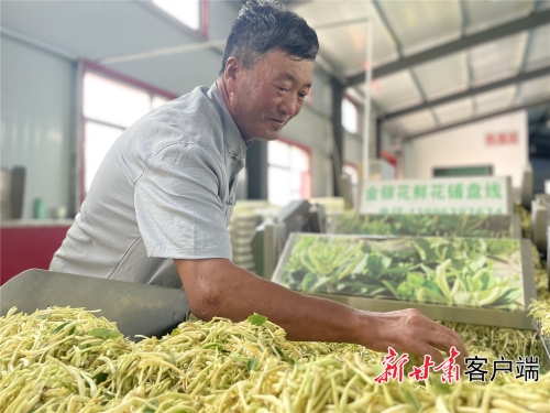 认真采摘的蒲月梅 直到2013年,通渭县首次引进金银花,在陇川镇新堡村、马营镇华川村等区域试验种植220亩,栽下产业发展的第一株苗。 3年过去,首批金银花进入盛花期。经过综合评估,亩均收益达3000元以上,所含绿原酸、木樨草苷含量高出国家药典标准1至2倍,药用价值高、市场前景广阔。 2017年起,通渭县大规模推广种植金银花。如今,全县种植面积达14万亩,种植农户4.5万户20.3万人。 从1株到14万亩,通渭金银花产业的蓬勃发展,与科学规划息息相关。 通渭县委、县政府着眼于产业转型升级,提出科学化布局、集约化种植、标准化生产,逐步走向精深化加工、品牌化营销的发展思路,按照“一基地两园区”架构,着力将通渭建设成花香四溢、“黄金”遍地的生态产业大园区。 引进山东九间棚集团智力支持,引导通渭县农发公司注资入股,共同打造起通渭清凉沅金银花产业扶贫开发公司,牵头组建专业合作社8个,带动农户3.2万户,开创了“龙头企业+合作社+基地(园区)+农户”一体发展新模式。 在李店乡李店村金银花初加工厂,村民孙克忠正在将收来的鲜花过机器装盘,之后送入烘干室。家门口的这份工作,让他每月收入达6000元。