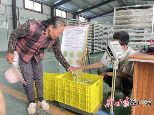 通渭清凉沅金银花产业扶贫开发公司在全县有11个烘干厂,每个烘干厂下面设3至5个收花点,群众将采摘的鲜花卖至收购点,再由收购点把花送到烘干厂进行加工。 早上11时许,在李家店乡李家店村收购点前来送花的群众络绎不绝。祁家咀村村民张秋莲就是其中之一,她采收了14斤金银花,对标、过秤,很快就拿到了174.6元。 从1株到14万亩,通渭金银花产业的高质量发展,得益于全产业链的打造。 立足种苗培育,通渭县已建成金银花种苗研发组培中心1处、种苗培育基地2个150亩,年产种苗2200万株。 立足产业链延伸,去年以来,通渭抢抓东西部协作机遇,与山东省胶州市联合打造总投资1.5亿元的胶州·通渭金银花健康产业园,新建色选厂、提炼厂、日化厂……已研发金银花茶、金银花酒、金银花洗涤用品等系列产品16个。 临近中午,张秋莲将上午采摘的金银花送到收购点。