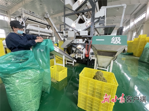 不久,产业园将全面竣工投产,届时可每年上缴利税1亿元以上,带动就业300至500人。 在产业园的带动下,通渭将逐步发展形成上游由科研院校驻点研发培育种苗、合作社带动农户种植采摘,中游由龙头企业带动合作社烘干加工,下游与中医药企业合作对接市场研发生产新产品的一体化发展链条,实现了“三产”深度融合、互促发展。 金银花开金银来,今年全县鲜花年产量预计达到3000万公斤、总产值预计突破6亿元,带动种植农户人均收入3000元以上。 从1株,到14万亩,到……金银花的故事还在继续。 胶州·通渭金银花健康产业园里已投产运营的色选厂里,工作人员正认真将干花进行等级色选。