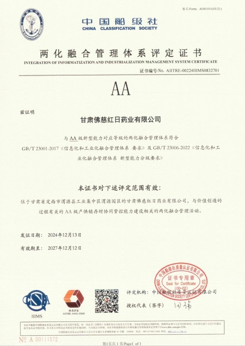 甘肃佛慈红日药业有限公司成功获得国家“AA级两化融合管理体系评定证书” |