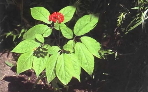 人参别名 人衔、鬼盖(《本经》),土精、神草、黄参、血参(《吴普本草》),地精(《广雅》),百尺杵(《本草图经》),海腴、金井玉阑,孩儿参(《纲目》),棒棰(《辽宁主要药材》)。药用部位为五加科植物人参的根。 植物形态多年生草本,高达60厘米。主根肥大,肉质,圆柱状,常分歧,由根上部二分歧者习称"灵体"或"横体";几不分歧或在下部分歧者习称"笨体"或"顾体";须根长,有多数小疣状物;根茎上有茎痕,有时生效条不定根。茎直立,绿色,细圆柱形,光滑无毛。叶轮生于茎端,数目依生长年限而不同,初生时为1枚3出复叶,二年生者为1枚5出掌状复叶,三年生者为2枚5出掌状复叶,四年生者为3枚,以后逐年增多,最后增至6枚;叶具长柄;小叶卵形或倒卵形,复叶基部的小叶较小,长2~3厘米,宽1~1.5厘米;上部的小叶长4~15厘米,宽2.2~4厘米;先端渐尖,基部楔形,下延,边缘具细锯齿,上面沿叶脉有直立刚毛,下面无毛;小叶柄长达2.6厘米。总花梗由茎端叶柄中央抽出,长约7~20厘米,顶生伞形花序,有十余朵或数十朵淡黄绿色的小花,通常在第四年开始开花;花有梗,两性及雄性;萼绿色,6裂;花瓣6,先端尖;雄蕊5;子房下位,2室,花柱2,在两性花中离生,在雄花中合生成中空的筒状。浆果状核果,肾形,成熟时鲜红色,每室含种子1枚。种子白色,扁平圆卵形,一侧平截。花期6~7月。果期7~9月。