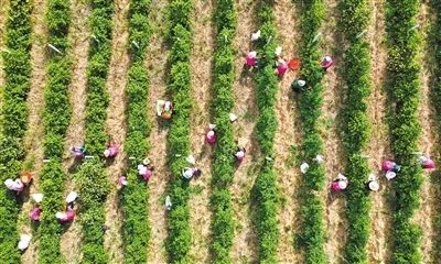 6月7日,通渭县李家店乡金银花标准化种植基地,村民在采摘。该基地1.5万亩金银花迎来丰收,每天可吸纳周边乡镇劳动力近300人。