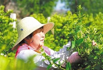 6月7日,通渭县李家店乡,农民在采摘金银花。张 赛摄