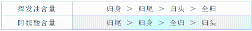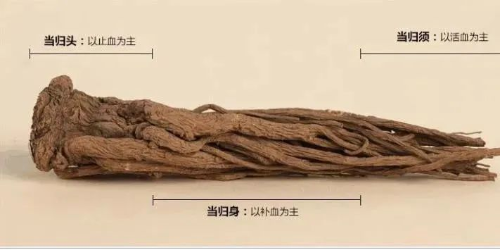 2.当归的“多重身份” 当归性温味甘、辛,具有补血活血,调经止痛,润肠通便之功效。主要成分为挥发油、多糖、氨基酸、有机酸等,而这些都造就了它的“多重身份”! 挥发油小队 这些小分子是当归的“活血止痛特工队”。其中藁本内酯被广泛用于心肌缺血、疼痛、糖尿病,尤其是缺血性脑损伤和中风等治疗。 有机酸战士 阿魏酸是其中的佼佼者,它能抑制血小板集聚和血栓素类物质释放,让你的血液不那么容易“结块”。 多糖英雄 它们除了是增强你免疫力的超级英雄,还有造血、抗肿瘤、抗氧化、防辐射等作用。 3.归头、归身、归尾,有何不同? 归头?归身?归尾?每部分的药效各不相同,且听小编一一道来。 才从土里采挖出来的当归称为全当归,可分为三部分:头部(归头)、中部(归身)、尾部(归尾)。而这种以不同部位入药的作法起源于唐代,形成于金元,兴盛于明清;经历代临床实践总结,逐渐确立了归头止血、归身补血、归尾活血、全当归补血活血的功效。现代临床多以全当归入药。