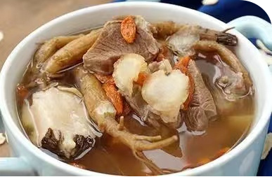 1.当归生姜羊肉汤 材料:当归、生姜各20g,羊肉150g,调料适量。 做法:将当归、生姜切片,羊肉洗净、切块,一同放入锅中。加入清水适量,用文火煮沸后去浮沫,煮至羊肉熟后加食盐调味,即可食用。 功效:补益气血、温中散寒、调经止痛。 除此之外,今天小编再为大家推荐两个当归的美食谱。