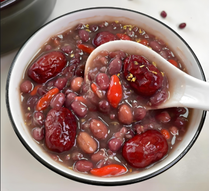 2.当归五红粥 材料:当归30g、黄芪6g、枸杞15g、红枣6粒、红豆30g、红皮花生米20g、红米30g、红糖20g。 做法:将当归、黄芪水煎40分钟后取之约100ml备用,枸杞、红枣、红豆、红皮花生米、红米放入陶罐中加400ml浸泡30分钟后,武火煎煮40分钟后加入备用黄芪当归汁100ml,加入红糖,文火煎煮10分钟后食用。 功效:益气固表、补肾益精、补血安神、健脾和胃。