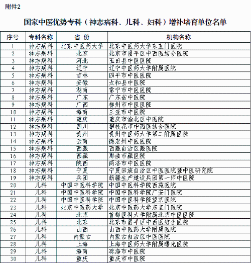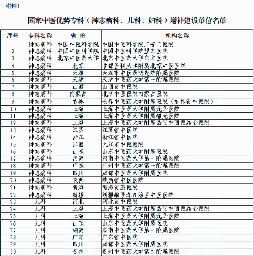 国中医药医政函〔2025〕257号各省、自治区、直辖市中医药主管部门,新疆生产建设兵团卫生健康委,中国中医科学院,北京中医药大学: 为贯彻落实《中共中央 国务院关于促进中医药传承创新发展的意见》和《“十四五”中医药发展规划》有关要求,落实好“儿科和精神卫生服务年”行动,补齐发展短板,填补省域空白,按照工作程序,我局遴选增补了48个国家中医优势专科(神志病科、儿科、妇科)建设单位(附件1)和42个国家中医优势专科(神志病科、儿科、妇科)培育单位(附件2),现予公布。请各省级中医药管理部门及专科所在单位按照《国家中医优势专科建设管理办法》有关要求做好专科管理和建设,确保专科建设取得实效。 附件:1.国家中医优势专科(神志病科、儿科、妇科)增补建设单位名单 2.国家中医优势专科(神志病科、儿科、妇科)增补培育单位名单 国家中医药管理局 2025年11月12日 (信息公开形式:主动公开)