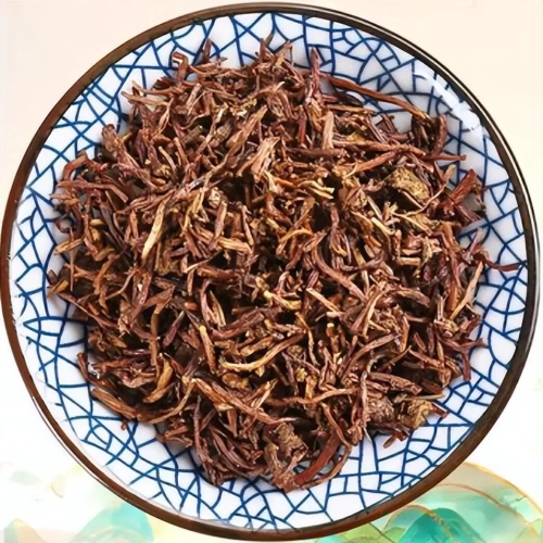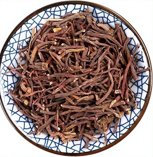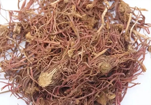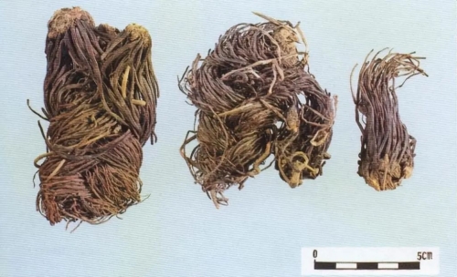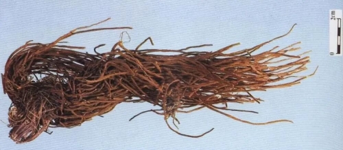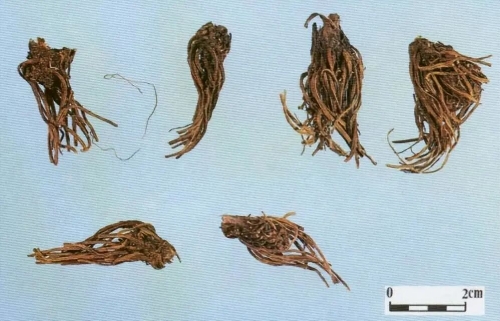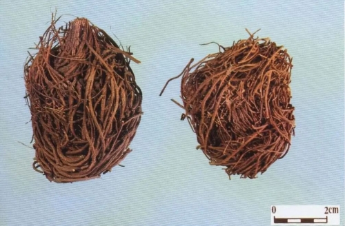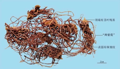 紫菀植物 【性状】 本品根茎呈不规则块状,大小不一,顶端有茎、叶的残基;质稍硬。根茎簇生多数细根,长3~15cm,直径0.1~0.3cm,多编成辫状;表面紫红色或灰红色,有纵皱纹;质较柔韧。气微香,味甜、微苦。