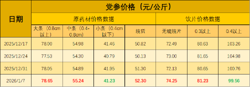 新华指数研究院监测数据显示,1月5日至1月9日,新华·中国(定西)中药材价格指数呈现开年交易活跃,备货驱动下稳步上行的运行特征。进入2026年1月,市场正式开启春节前的“冬储”与“备货”模式。受节日礼赠、冬季养生需求及药企开年生产计划的多重拉动,定西产地市场行情整体向好。具体表现为:党参、黄芪中大条货源走销顺畅,价格微幅回升;当归统货需求强劲,支撑价格重心上移;金银花则在供需平衡中继续保持稳定。整体看,市场信心充足,呈现出稳中有升的“开门红”态势。 党参 党参行情受成本驱动效应影响显著,呈现“原药材领涨,饮片跟涨”的特点。监测数据显示,党参大条均价由78.05元/公斤升至78.65元/公斤,统货价格从51.30元/公斤涨至52.30元/公斤。由于近期药企开年生产计划及备货需求集中,原药材走动频繁且价格坚挺,使得加工户的原料成本大幅抬升;受此影响,饮片环节被动跟涨。 新华·中国(定西)中药材价格指数-党参价格信息表