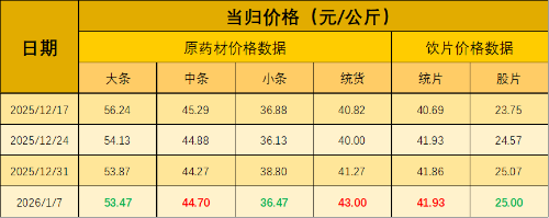 数据来源:新华财经数据库 当归 当归行情在僵持中实现突破,统货规格表现优于大规格货源。监测数据显示,当归统货价格由41.27元/公斤上涨至43.00元/公斤,当归中条价格微幅上扬。随着春节备货窗口期的缩短,下游药企及经销商针对适宜加工的统货货源采购意愿较强。虽然部分高等级大条货源因价位偏高存在少量议价空间,但在统货强劲需求的拉动下,当归整体市场行情依然呈现出重心上行的稳健势头。 新华·中国(定西)中药材价格指数-当归价格信息表