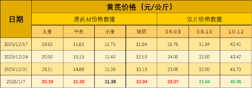 数据来源:新华财经数据库 黄芪 黄芪价格呈现“分化式上涨”,中大条规格领涨明显。其中大条均价由18.31元/公斤涨幅至20.19元/公斤,统货由13.13元/公斤升至13.94元/公斤。价格上涨的核心驱动力在于终端消费的集中增长:目前正值冬季滋补最旺季,黄芪作为药食同源的核心品种,在节日礼品市场和药膳终端走货顺畅,直接带动了产地大条货源因供应相对偏紧而价格上涨。尽管部分高规格饮片出现微幅震荡,但整体行情受原药材支撑表现稳健。 新华·中国(定西)中药材价格指数-黄芪价格信息表