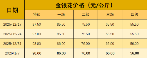 数据来源:新华财经数据库 金银花 金银花价格继续保持全线持平状态,特级、一级至四级价格分别稳定在98元、86元、76元、66元及56元/公斤。 新华·中国(定西)中药材价格指数-金银花价格信息表
