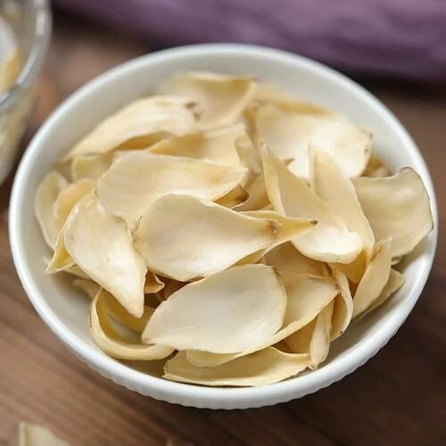 3.百合又称干百合,为百合科植物卷丹、百合或细叶百合的干燥肉质鳞叶。秋季采挖,洗净剥取鳞叶,置沸水中略烫,干燥。特性、味道与对应的经络:甘,寒。归心、肺经。功效与应用:养阴润肺,清心安神。用于阴虚久咳,痰中带血,虚烦惊悸,失眼多梦,精神恍惚。【如何识别】眼看:本品呈长椭圆形,长2~5厘米,宽1~2厘米,中部厚1.3~4毫米。表面类白色、淡棕黄色或微带紫色,有数条纵直平行的白色维管束。顶端稍尖,基部较宽,边缘薄,微波状,略向内弯曲。手摸:质硬而脆,易折断,断面较平坦,角质样。百合鲜品含黏液。鼻闻:气微,无臭。口尝:味微苦。质量以鳞叶均匀、肉厚、筋少、淡黄白色、味微苦者为佳。新鲜百合不发黑。干百合淡黄色为好,大小要均匀,以自然的黄白色(如颜色非常洁白,可能经过硫黄熏制)、不变质、不变色、无虫蛀、无异味者为佳。