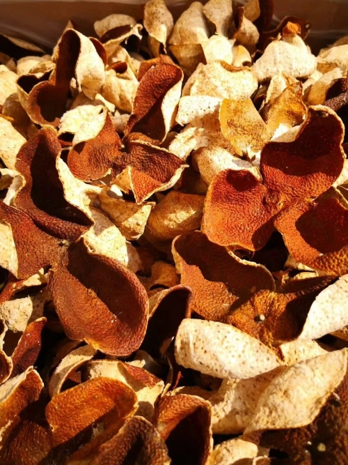 2.陈皮又称橘皮、新会皮、广陈皮,本品为芸香科植物橘及其栽培变种的干燥成熟果皮。 特性、味道与对应的经络:苦、辛,温。归肺、脾经。 功效与应用:理气健脾,燥湿化痰。用于胸脘胀满,食少吐泻,咳嗽痰多。 【如何识别】眼看:陈皮外表面橙红色或红棕色,有细皱纹及凹点;内表面浅黄白色,有黄白色或黄棕色筋络。手摸:质稍硬而脆。鼻闻:有特殊香气。口尝:味辛、苦。质量以皮薄、色红、油润、香气浓郁、陈久者为佳。