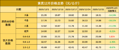 数据来源:新华财经数据库 黄芪 12月份黄芪走势呈现窄幅震荡的态势。12月初黄芪新货上市与冬季滋补需求形成博弈,各规格黄芪价格维持在12-45元/公斤之间。月中虽一度受供应量增加影响面临下行压力,但随着气温下降,黄芪作为冬季大宗滋补品的终端消耗加快,优质规格货源询价热情提升,支撑价格止跌企稳并小幅回升。进入下旬,在节假日备货需求的拉动下,黄芪整体交易较为活跃。截至12月末,各规格黄芪价格收于11-41元/公斤之间。 新华·中国(定西)中药材价格指数-黄芪价格信息表