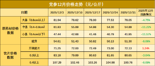 整体而言,2025年12 月定西中药材市场在经历供应洪峰后,基本面逐步改善。面对外地货源冲击及库存攀升的市场现状,建议相关部门进一步强化市场监测与风险预警机制,引导种植户及持货商理性看待市场波动,避免恐慌性抛售。同时,统筹区域产能布局,保障产业健康可持续发展。 新华指数研究院监测数据显示,2025年12月,新华·中国(定西)中药材价格指数呈现前期承压调整,后期企稳回升的运行特征。 12月上旬及中旬,受新产季干货大量上市及外地低价货源流入主产区的冲击,市场一度呈现“量大无价”的局面,导致主导品种价格出现明显回调。进入下旬,随着冬季滋补消费进入旺季,叠加节假日前药企及终端备货需求全面启动,市场交易活跃度回升,带动指数止跌回暖。 党参 2025年12月份党参行情呈现“先跌后稳、触底回暖”的特征。12月初各党参规格品价格保持在47-107元/公斤之间,受产地鲜货加工提速及周边外地低价货源大量倒流进入甘肃市场影响,供需平衡被打破,导致价格承压下行,市场呈现“量大无价”的疲软态势。进入下旬,随着价格风险释放及节日备货启动,高性价比药厂货走销明显加快,吸引了中成药企业采购,市场支撑效应显著增强,带动持货商心态转为乐观,价格成功于底部区间筑稳,并呈现出止跌回暖的态势。截至12月末,各规格党参价格收于41-100元/公斤之间。 新华·中国(定西)中药材价格指数-党参价格信息表