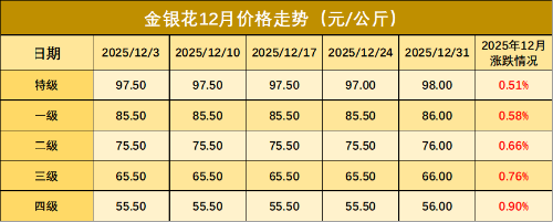 数据来源:新华财经数据库 金银花 12月份金银花行情始终保持平稳,波动极小。12月初各规格金银花价格保持在55.5-97.5元/公斤之间,由于12月处于金银花的种植休眠期且非产新季节,市场交易主要依赖既有库存消化,供需双方处于相对平衡状态。全月未受新货或突发性需求干扰,金银花价格既无新货冲击的压力,也无大幅上涨的动力,全月维持窄幅整理走势。截至12月末,各规格金银花价格收于56-98元/公斤之间。 新华·中国(定西)中药材价格指数-金银花价格信息表