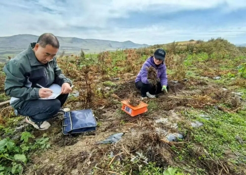 工作人员在地里记录黄芪鲜货重量。受访者供图